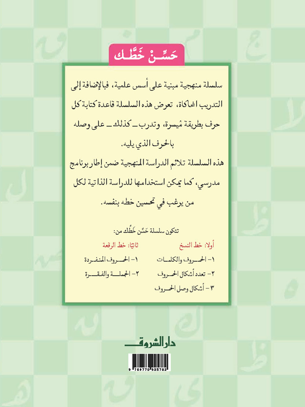سلسلة "حَسِّن خَطَّك" هي سلسلة منهجية مبنية على أسس علمية، فبالإضافة إلى التدريب على كتابة الخط العربي بطريقة سليمة، تعرضُ هذه السلسلةُ قاعدة كتابة كل حرف بطريقة مُيسرة، وتُدرِّب على وصله بالحرف الذي يليه. هذه السلسلة تلائمُ الدراسة المدرسية، كما يمكن استخدامُها للدراسة الذاتية لكل مَن يرغب في تحسين خَطِّه بنفسه.