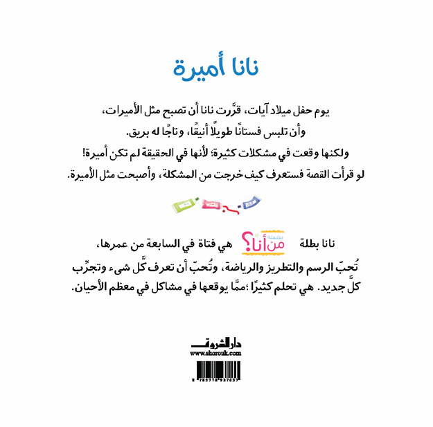 يوم حفل ميلاد آيات، قررت نانا أن تصبح مثل الأميرات، ولكنها وقعت في مشكلات كثيرة لأنها في الحقيقة لم تكن أميرة! هيا نقرأ القصة لنعرف هل ستنجح نانا في أن تكون أميرة؟ نانا بنت في السابعة من عمرها، تريد أن تعرف كل شيء وتجرب كل جديد، وتأخذها أحلامها وخيالها لمختلف المغامرات.. والمشكلات أحيانًا!
