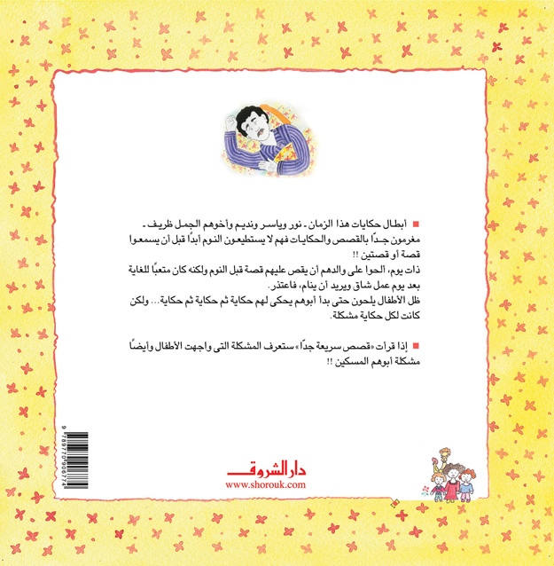 عادَ الأبُ من العمل وانتظر الأطفالُ أن يحكي لهم قصة كما تعودوا كل ليلة، لكنه كان مُتعبًا، وعندما ألحّوا عليه كثيرًا حكى لهم قصة سريعة جدًّا لم تُشبع نهمهم للحكايات، لكن الأب أصرّ أنها قصة لها بداية ونهاية وبها شخصيات! مَن سينتصر.. الأب أم الأطفال؟ قصة طريفة عن ابتكار القصص وإطلاق الخيال والإلحاح والنوم اللذيذ.