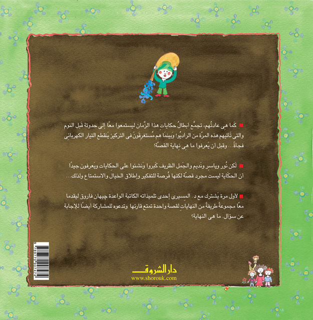 كما هي عادتهم، تجمّع أبطال "حكايات هذا الزمان" ليستمعوا معًا إلى حدوتة قبل النوم والتي تأتيهم هذه المرة من الراديو، وبينما هم مستغرقون في التركيز ينقطع التيار الكهربائي فجأة قبل أن يعرفوا نهاية القصة! لكن نور وياسر ونديم والجمل ظريف كبروا ونشئوا على الحكايات، ويعرفون جيدًا أن الحكاية ليست مجرد قصة، لكنها فرصة للتفكير وإطلاق الخيال والاستمتاع. في هذه القصة يشترك الدكتور عبد الوهاب المسيري مع إحدى تلميذاته؛ الكاتبة الواعدة جيهان فاروق، ليقدما معًا مجموعة طريفة من النهايات لقصة واحدة تُمتع قارئها وتدعوه للمشاركة في البحث عن إجابة سؤال: ما النهاية؟