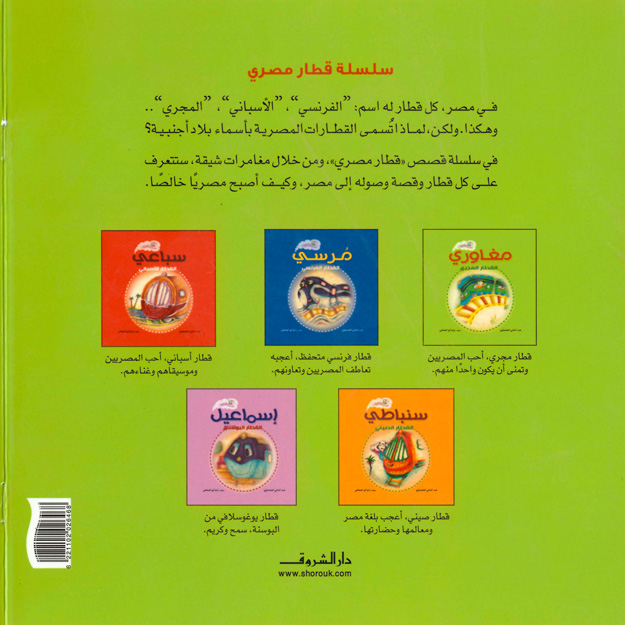 هذه قصة القطار المجَري الذي أحب المصريين وتمنى أن يكون واحدًا منهم. في مصر كل قطار له اسم: الفرنسي، الإسباني، المجَري، وهكذا، ولكن لماذا تُسمى القطاراتُ المصرية بأسماء بلاد أجنبية؟ في سلسلة قصص "قطار مصري"، ومن خلال مغامرات شيقة وطريفة، ستتعرف على كل قطار وقصة وصوله إلى مصر، وكيف أصبح مصريًّا خالصًا. سلسلة تدعم مفهوم الهوية والوطنية ومعنى أن تكون مصريًّا.