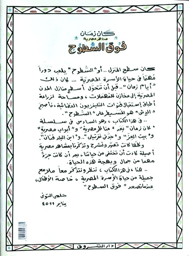 كان سطح المنزل أو "السطوح" يلعب دورًا مهمًّا في حياة الأسرة المصرية. كان ذلك "أيام زمان"، قبل أن تتحول أسطحُ منازل المدن المصرية إلى مخازن للمهمَلات، ومساحة لزراعة أطباق استقبال قنوات التلفزيون الفضائية، فأصبح "الدِّش" هو المسيطر على السطوح. هذا الكتاب يُصوّر ويُبرز مشاهد مصرية أصيلة كادت أن تختفي من حياتنا، بعد أن كانت جزءًا مهمًّا من جَمال هذه الحياة وبهجتها. فدعونا ننظر ونتذكر معًا لقطات جميلة من حياة الأسرة المصرية، وبخاصة الأطفال، فوق السطوح.