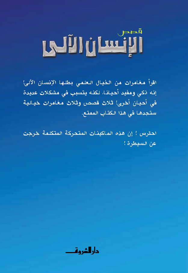 اقرأ مغامرات من الخيال العلمي بطلها الإنسان الآلي. إنه ذكيّ ومُفيد أحيانًا، لكنه يتسبَّب في مشاكلَ عديدة في أحيانٍ أخرى! ثلاث قصص وثلاث مغامرات خيالية ستجدها في هذا الكتاب الممتع، ولكن احترس، فهذه الماكينات المتحركة المتكلمة خرجتْ عن السيطرة!
