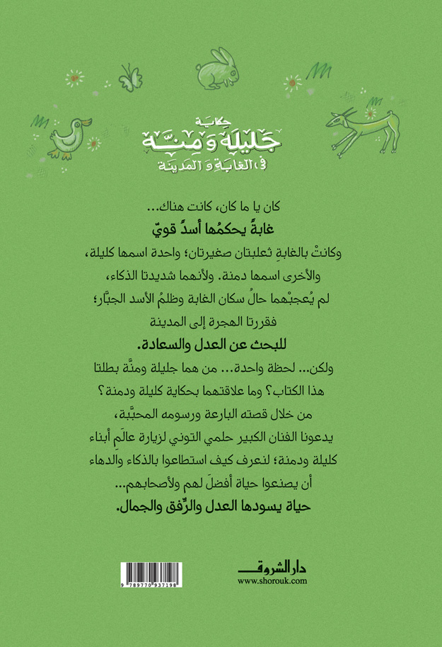 كان ياما كان.. كان هنا غابة يحكمها أسد قوي، وكانت بالغابة ثعلبتان صغيرتان؛ واحدة اسمها كليلة والأخرى اسمها دمنة، ولأنهما شديدتا الذكاء لم يعجبهما حال سكان الغابة وظُلم الأسد الجبار؛ فقررتا الهجرة إلى المدينة للبحث عن العدل والسعادة. ولكن.. لحظة واحدة.. مَن هما جليلة ومنة بطلتا هذه القصة؟ وما علاقتهما بحكاية كليلة ودمنة؟ من خلال قصته البارعة ورسومه المحببة يدعونا الفنان الكبير حلمي التوني لزيارة عالم أبناء كليلة ودمنة؛ لنعرف كيف استطاعوا بالذكاء والدهاء أن يصنعوا حياة أفضل لهم ولأصحابهم، حياة يسودها العدل والرفق والجمال.
