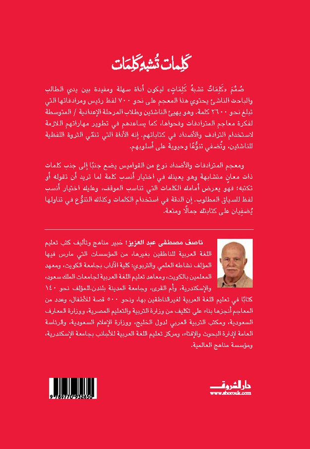 صُمِّم "كلمات تشبه كلمات" ليكون أداة سهلة ومفيدة بين يدَي الطلبة في المرحلة الإعدادية وما بعدها. يحتوي هذا المعجم على نحو 700 لفظ رئيس ومرادفاتها التي تبلغ نحو 2600 كلمة. وهو يُهيئ الناشئين لفكرة معاجم المترادفات واستخداماتها، كما يساعدهم في تطوير مهاراتهم اللازمة لاستخدام الترادف والأضداد في كتاباتهم. إنه الأداة التي تُنمي الثروة اللفظية للطلبة وتُضفي تنوعًا وحيوية على أسلوبهم. إن معجم المترادفات والأضداد هو نوع من القواميس يضع جنبًا إلى جنب كلمات ذات معانٍ متشابهة، ليُعينك في اختيار أنسب كلمة لما تريد أن تقوله أو تكتبه؛ فهو يعرض أمامك أمثلة للكلمات التي تناسب الموقف، وعليك اختيار أنسب لفظ للسياق الذي تعنيه. إن الدقة في استخدام الكلمات، وكذلك التنوع في تناولها يُضفِيان على كتابتك جمالًا ومُتعة.